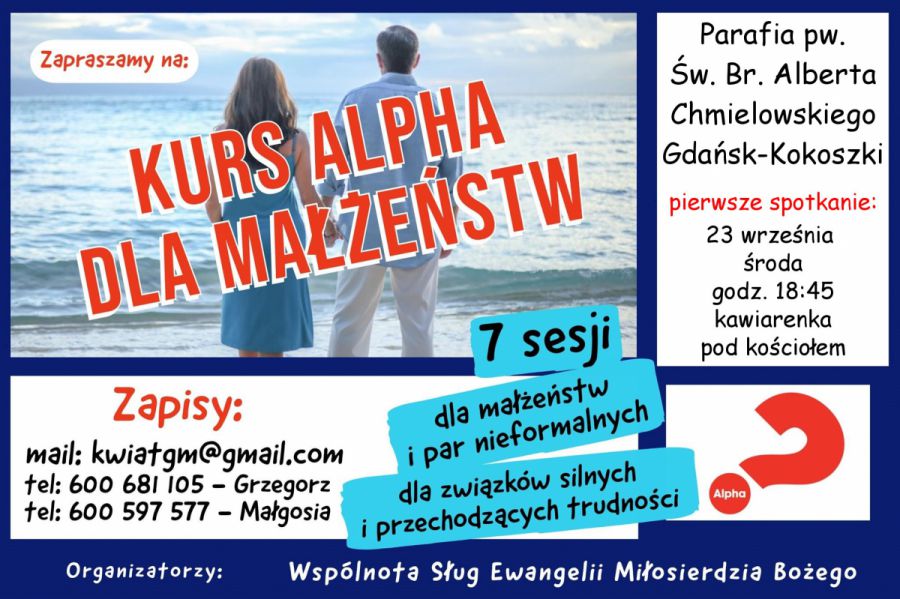 Zapraszamy na kurs ALPHA dla małżeństw i par nieformalnych organizowany przez wspólnotę Sług Ewangelii Miłosierdzia Bożego. Kurs obejmuje siedem sesji, dotyczących najważniejszych aspektów życia małżeńskiego (m.in. rozwiązywania konfliktów, przebaczenia). Spotkania mają formę konferencji i ćwiczeń, w trakcie których małżonkowie rozmawiają w parze między sobą. Kurs rozpoczyna się w środę, 23 września o godz.18.45, w kawiarence pod naszym Kościołem.