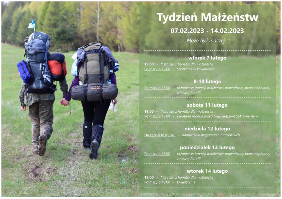 W dniach od 7 do 14 lutego 2023 odbywać się będzie w naszej parafii Tydzień małżeństw, czyli akcja modlitewna w intencji małżeństw. Szczegóły znajdują się na plakacie. Szczególnie zapraszamy we wtorek 7 lutego, w sobotę 11 lutego oraz we wtorek 14 lutego, czyli w walentynki na godzinę 19:00 na Mszę św. w intencji małżonków.